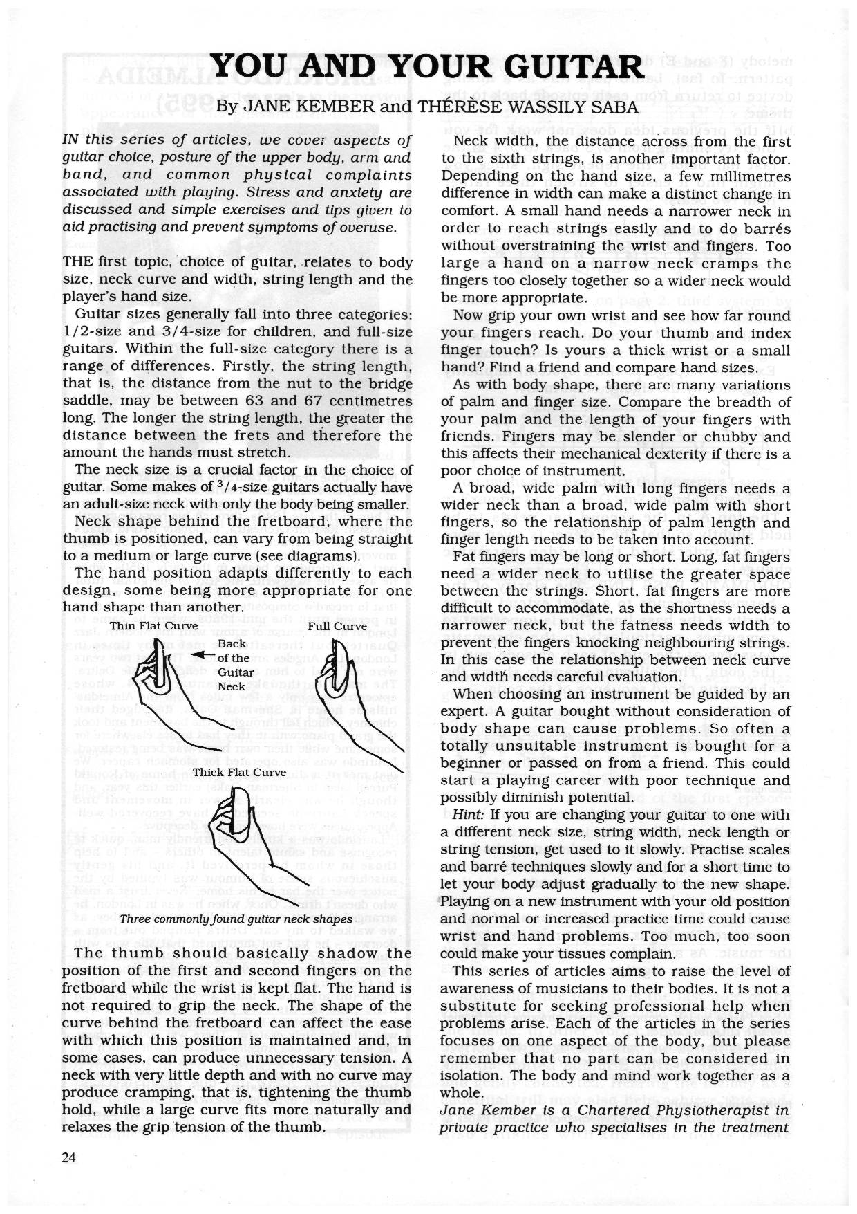 IN this series of articles, we cover aspects of guitar choice, posture of the upper body, arm and hand, and common physical complaints associated with playing. Stress and anxiety are discussed and simple exercises and tips given to aid practising and prevent symptoms of overuse.
