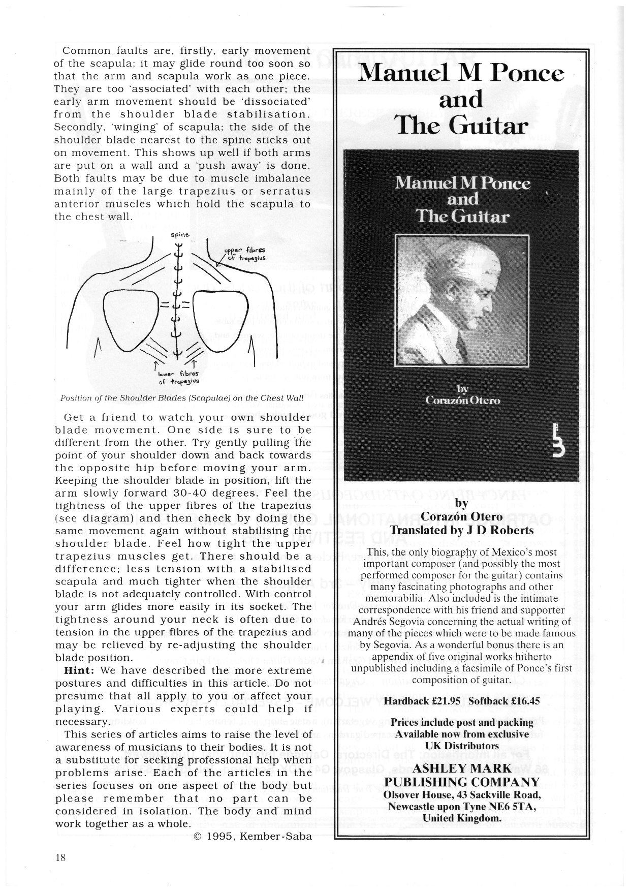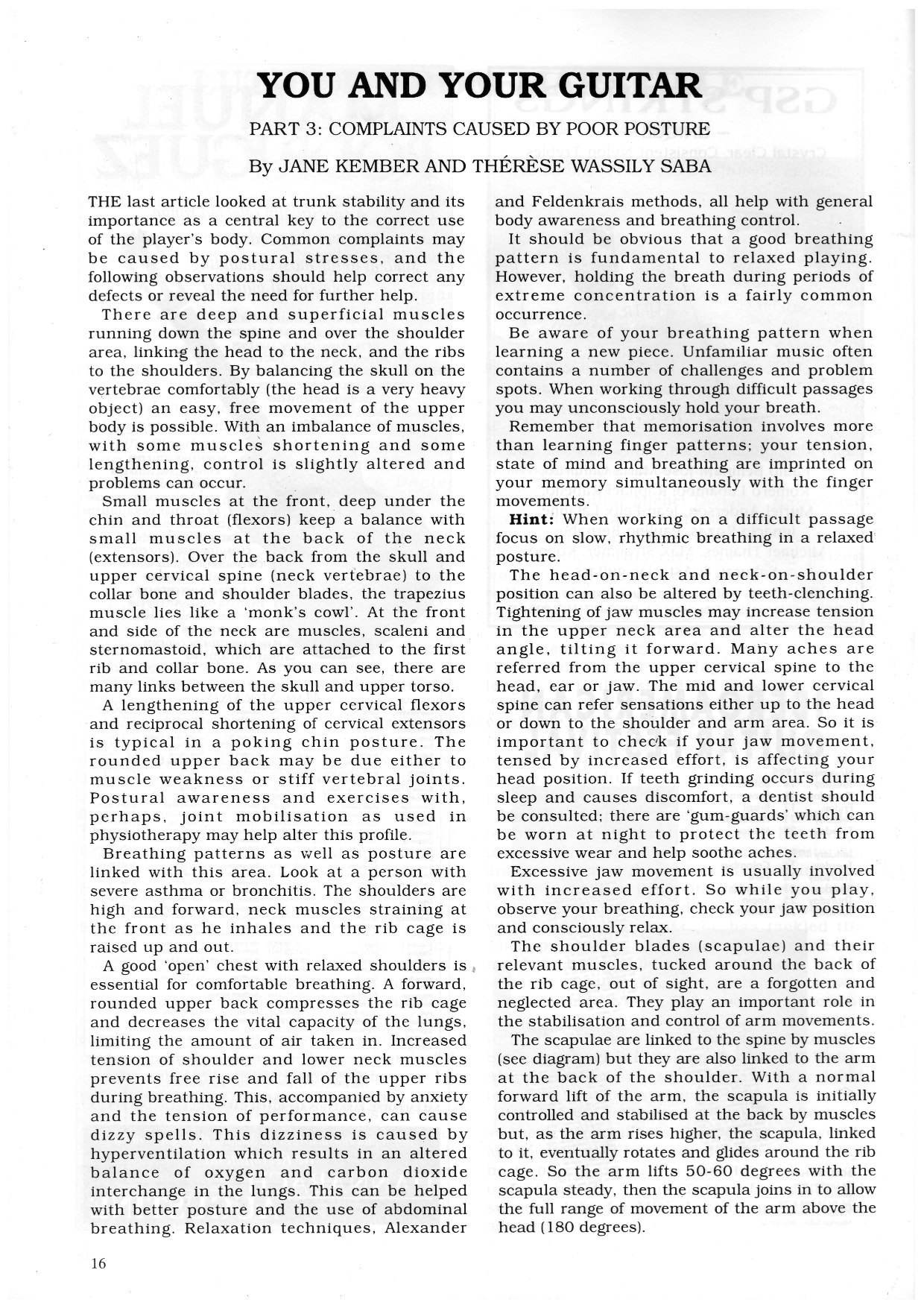 You and Your Guitar is a series of eight articles which I wrote with the chartered physiotherapist Jane Kember, who at the time was also working as an advisor for BAPAM, the British Association for Performing Arts Medicine; they were published in Classical Guitar magazine from November 1995–September 1996. While the illustrations are ‘rudimentary’, hopefully the text might have some useful ideas.